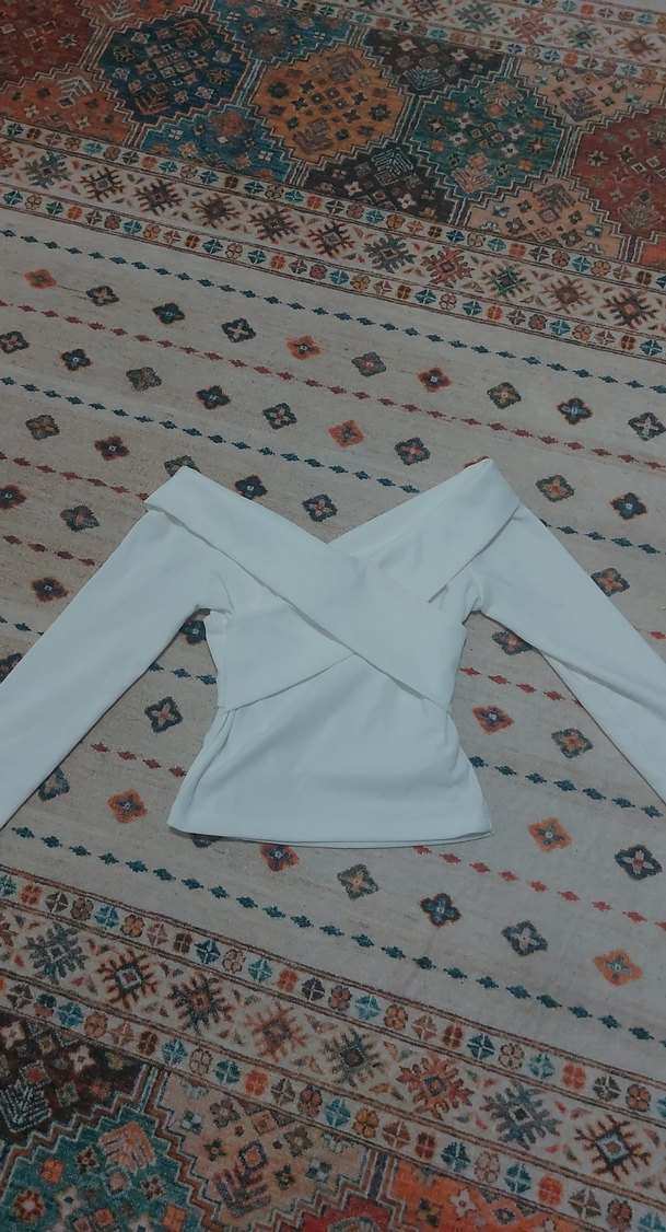 Beyaz mini bluz, uzun kollu ve V yakalıdır. Kemer detayıyla dikkat çeker, rahat sentetik kumaştan üretilmiştir. Kumaşı kalın iç göstermiyor.