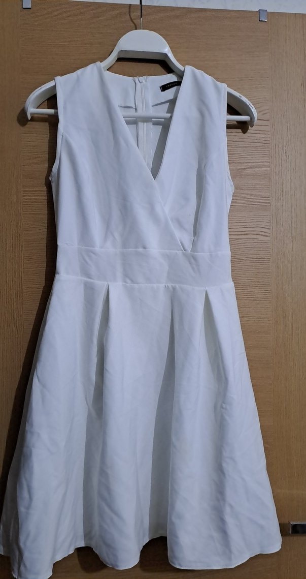 V yaka ve kolsuz beyaz mini elbise,bazı yerlerinde sarı lekeler var