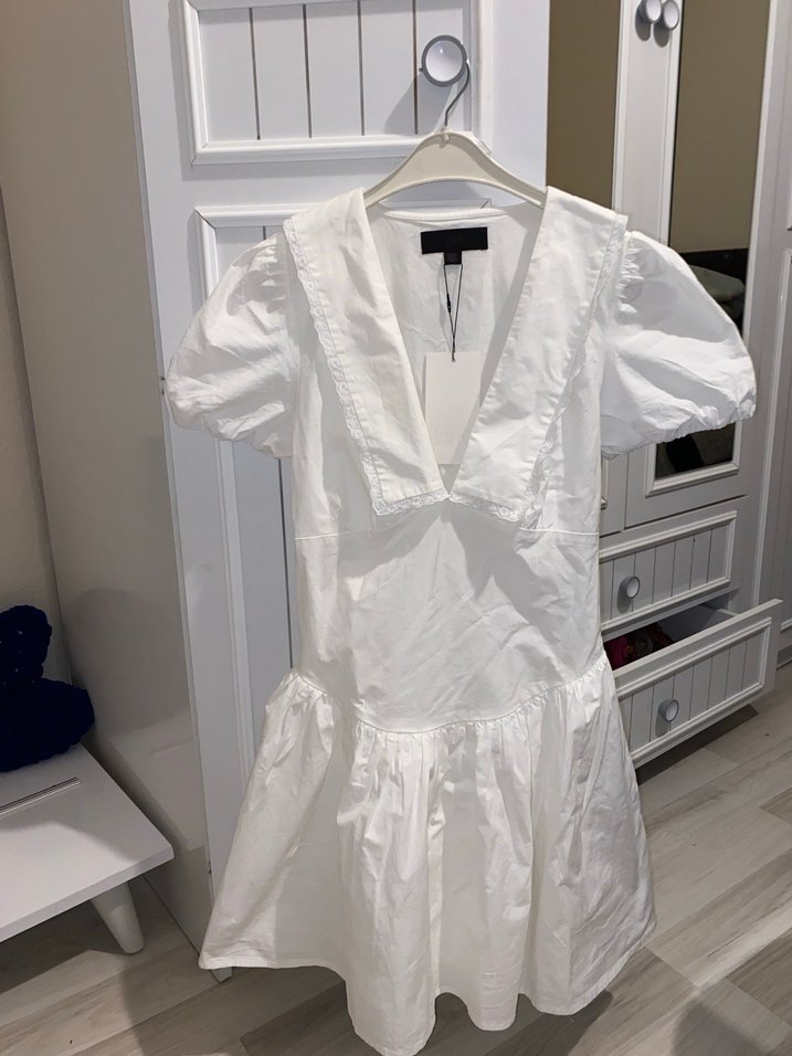 V yaka, kısa kollu, salaş kesime sahip beyaz midi elbise. Drapeli tasarımı ve sokak modası tarzıyla günlük kullanıma uygun.
