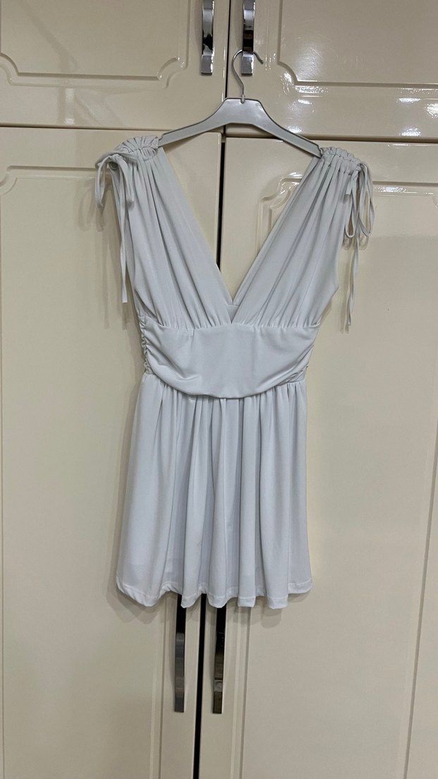 V Yaka Beyaz Mini Drapeli Elbise