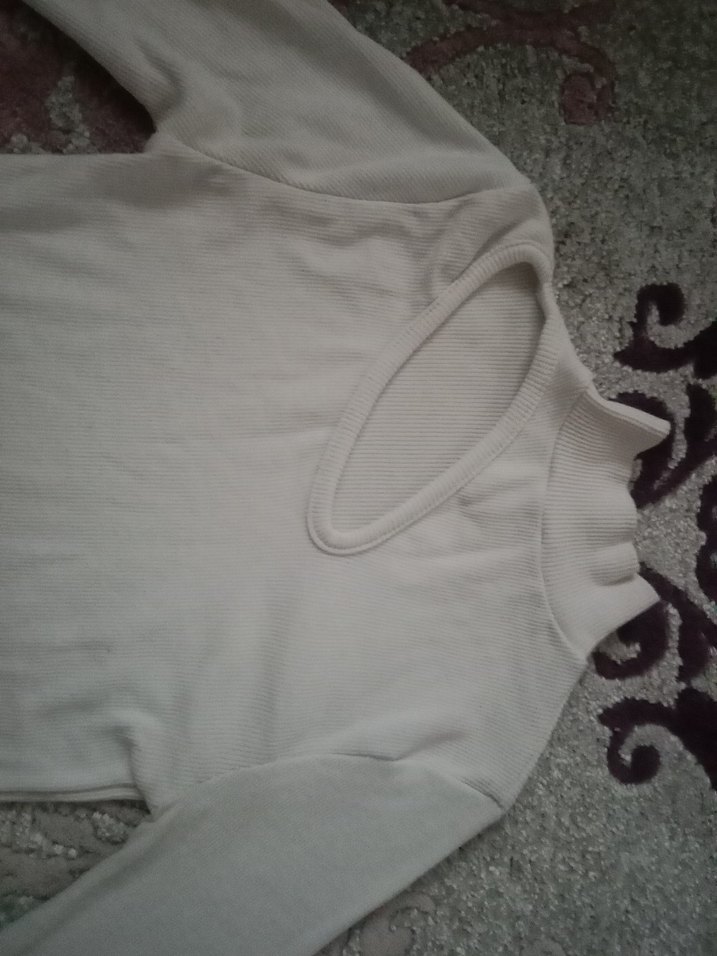 Beyaz, V yaka, uzun kollu, kısa kesim kadın kazak. Yumuşak sentetik kumaştan rahat ve şık, günlük kullanım için uygun.