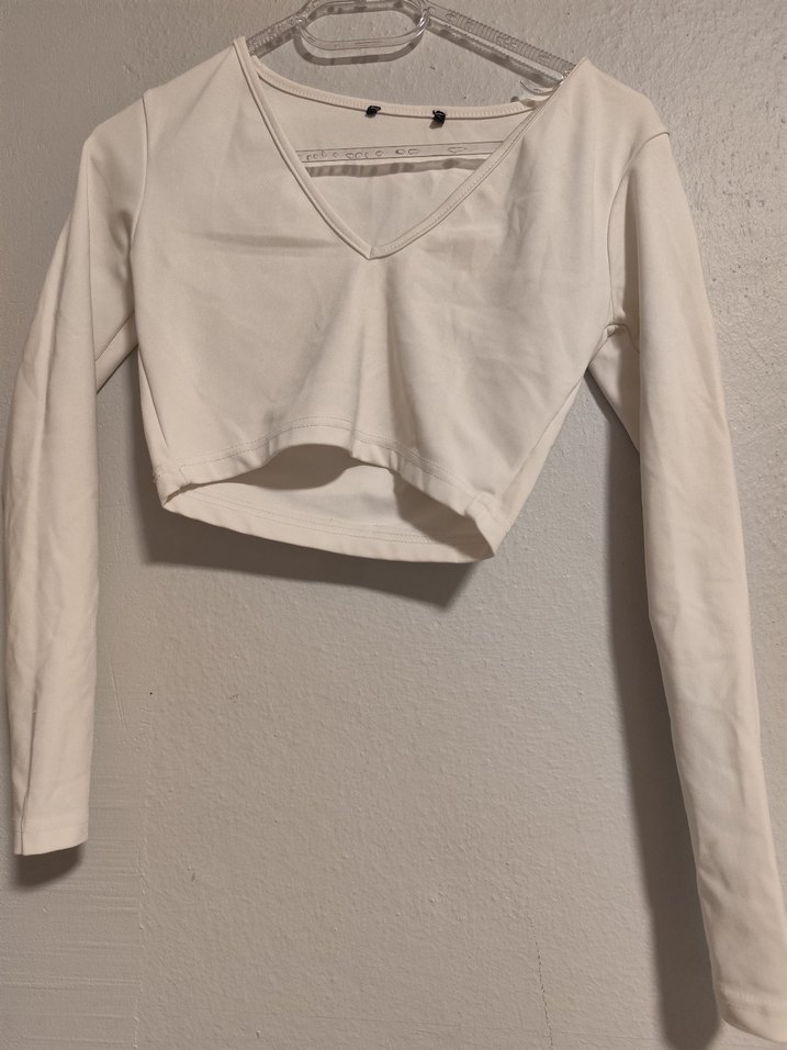 scuba, uzun kollu, V yakalı ve kısa kesim olan bu beyaz kadın bluz, minimalist ve desen içermeyen tasarımıyla rahat ve şık bir sokak stili sunar. Günlük kullanıma uygundur.