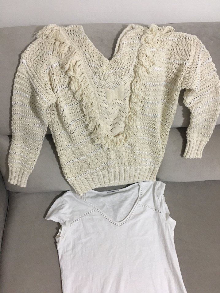 Fotoğrafta paylaştım arkadan on taraf püsküllü üsten aplik makine dikişini var komple çıkartılabilir sırt taraf gibi sade 4/8 no foto örgü mevsimlik kulanılır sadece püskülleri kenardan kesilebilir 6no yakın foto ortadaki aplik kalır 12 no iç paylaştım aplik dikişi görülüyor Tercihine göre Kırık Beyaz, V yakalı, uzun kollu ve bol Midi boyda ve rahat bir görünüme sahip. Göğsünde püskülü detay üsten aplik İstenirse çıkartılır Tam beyaz tişört saf pamuklu İstenirse 50TL