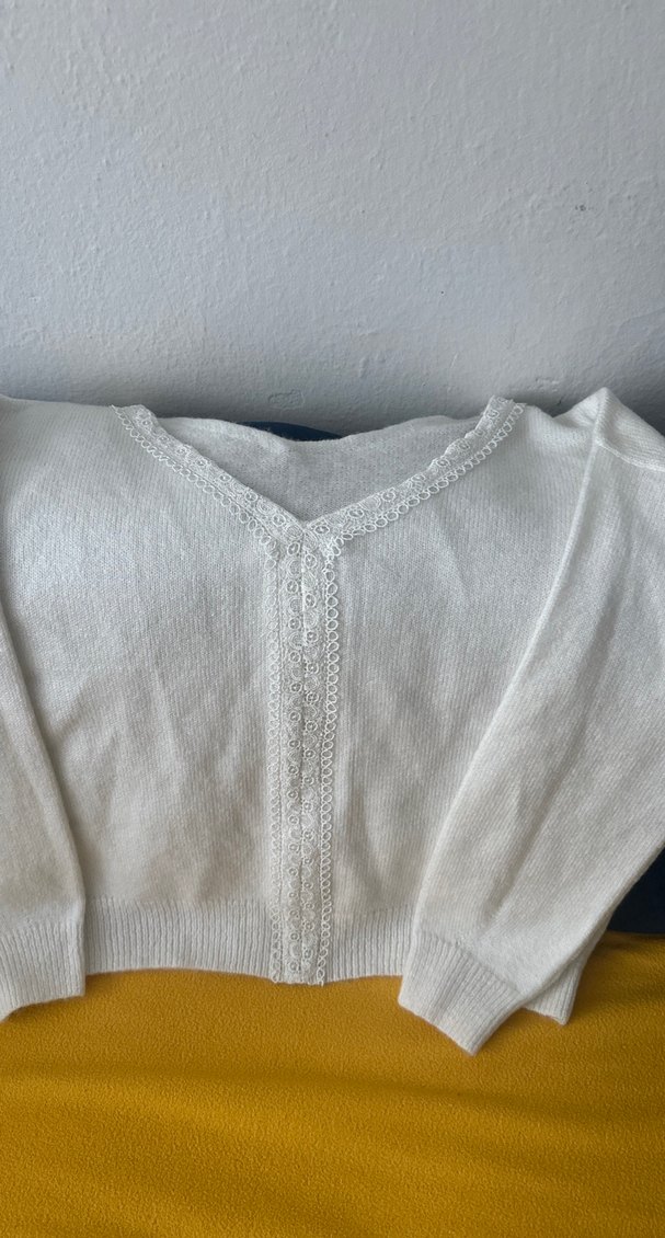 V yaka ve uzun kollu kadın kazak, yumuşak örgü kumaştan, rahat kesimlidir. Beyaz renkte, yakada ince dantel detaylarıyla günlük kullanıma uygun bohem tarzda bir üründür. İki koltuk arası 60 cm Koltuktan eteğe 36 cm Komple boyu 55 cm
