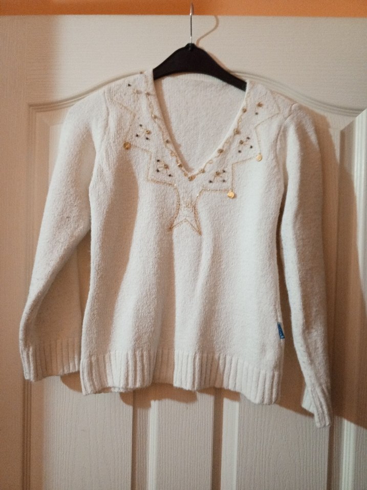 Bu beyaz örgü kadın kazağı, V yaka ve uzun kollu olup, bol kesimiyle rahat ve bohem bir stil sunar. Boyu 50cm. İki kol arası ölçüsü 41cm. S-M uyumludur. Esnektir. İade yoktur