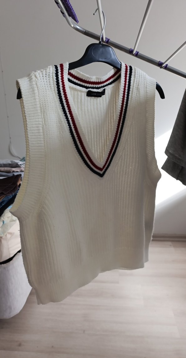 Kırmızı ve siyah çizgili V yakalı, beyaz örgü süveter. Salaş kesim ve normal boyda, günlük rahat stil için uygundur.