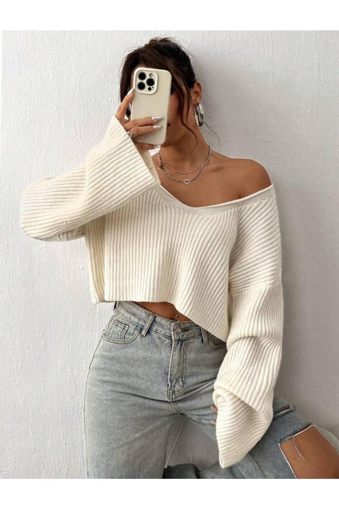 V Yaka Beyaz Örgü Salaş Kazak