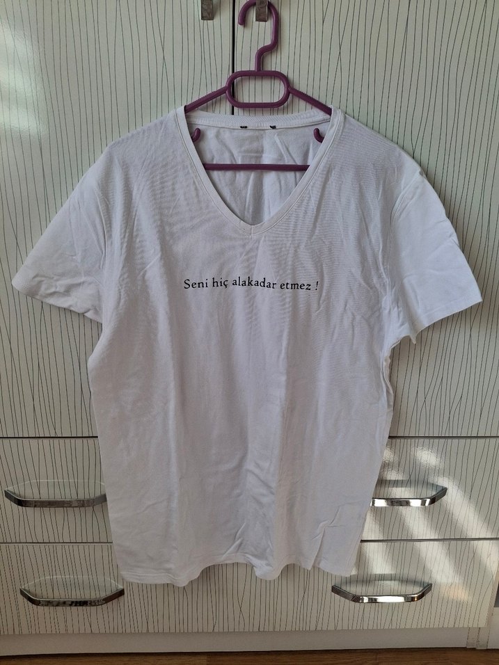 Beyaz pamuklu tişört, V yaka ve kısa kolludur. Önünde "Seni hiç alâkadar etmez!" yazılı baskı bulunur, rahat ve trend sokak giyimi tarzındadır.