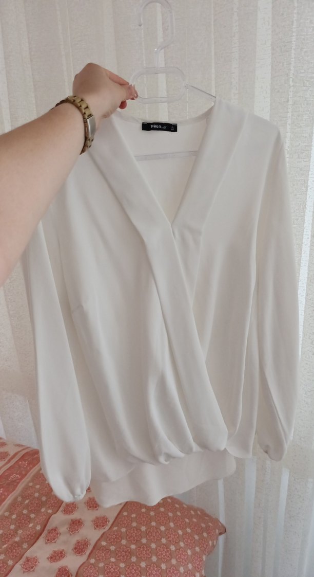 V yaka, uzun kollu, beyaz salaş gömlek. Yumuşak sentetik kumaştan, drapeli ve normal boyda, günlük kullanıma uygun. L/40 beden