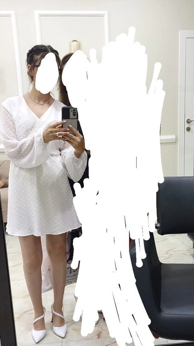 V yaka ve uzun kollu, hafif dokulu şifon kumaştan yapılmış beyaz mini düğün elbisesi. Bir kere ablamın kınasında giyindim önünü terzide kapattırdım ama açtırabilirsiniz. M Beden ama S bedene de uygun bence.