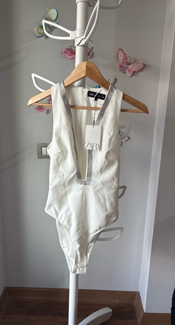 S beden. Askılı, beyaz kadın body, derin V yakalı taşlı ve fermuarlı. Yaka çevresinde gri baskılı detaylar bulunur.