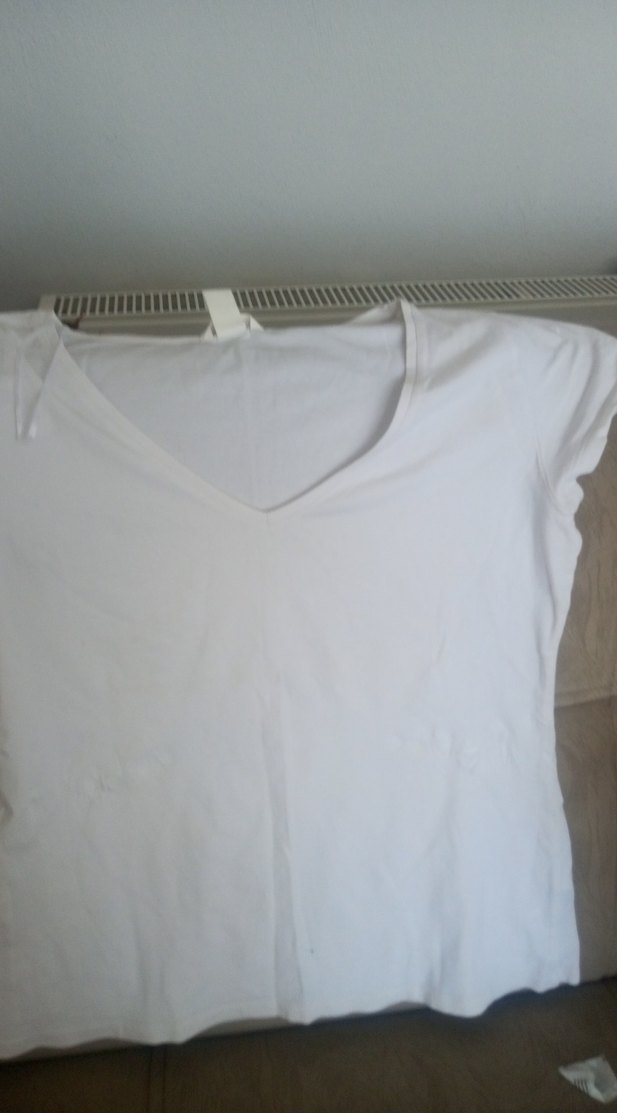Yumuşak keten kumaştan, V yakalı, kısa kollu beyaz hamile tişörtü. Rahat kesimi ve normal uzunluğu ile günlük kullanıma uygundur.
