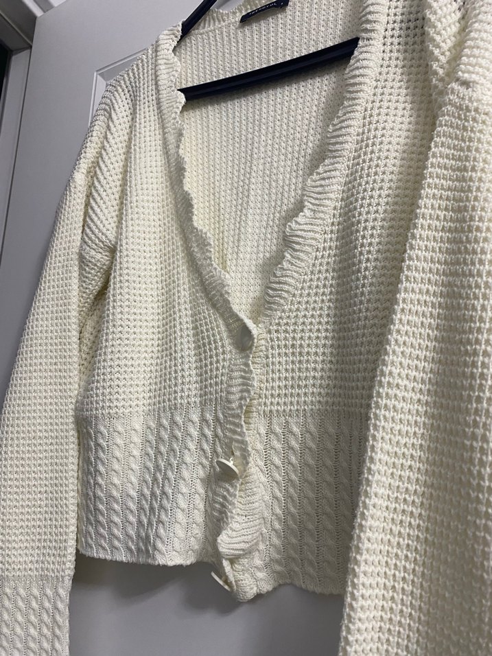 Beyaz triko hırka, V yaka ve uzun kollu, Bol kesim ve bohem tarzıyla günlük kullanıma uygun