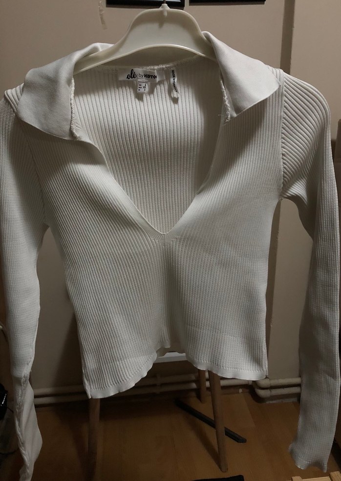 Beyaz triko kumaştan üretilmiş, V yaka ve uzun kollu, vücuda oturan kesime sahip midi boy kadın kazak. Minimalist ve gündelik stil için uygun.