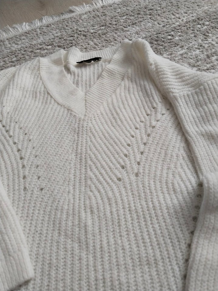 V yaka ve uzun kollu, beyaz triko kadın kazak, rahat kesimi ve sade dokusuyla günlük kullanıma uygundur.