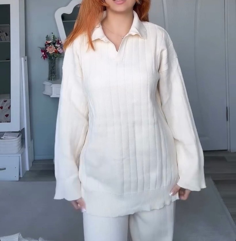 V yaka ve uzun kollu beyaz triko kazak ve pantolon Takım , rahat kesimiyle ve yumuşak keten kumaşıyla günlük sokak stiline uygun rahat bir seçimdir.