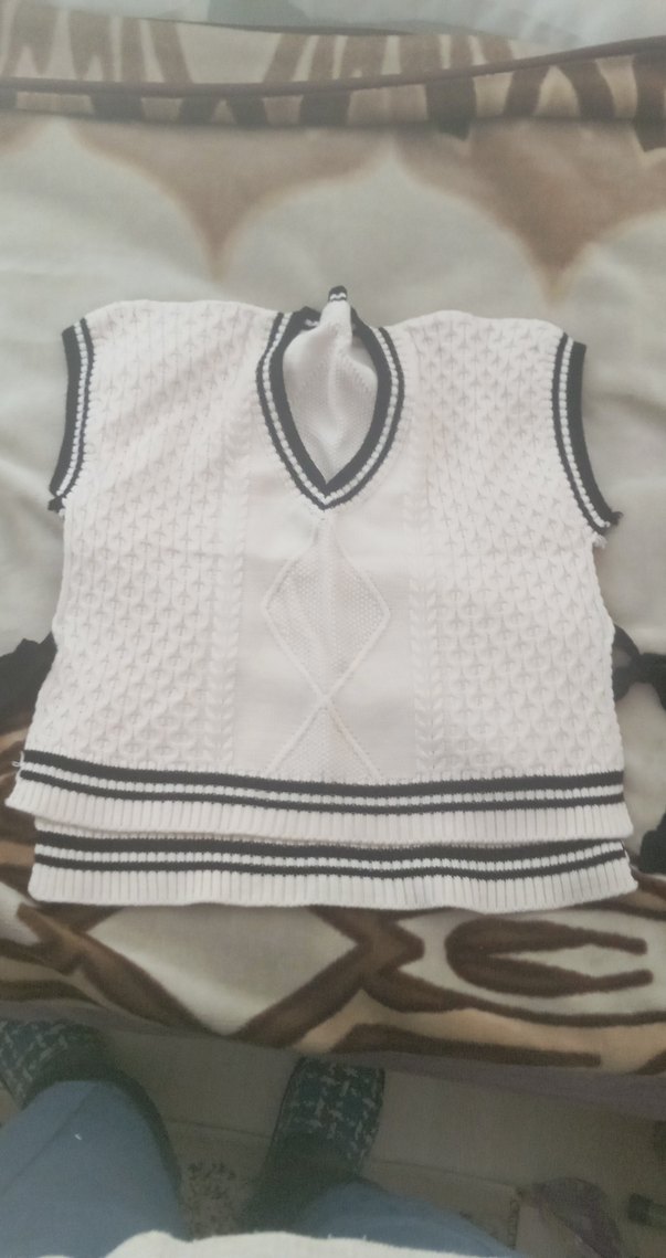 V yakalı, beyaz renkli ve örgü kumaştan yapılmış, kolu olmayan süveter. Kenarlarında siyah şerit detayları bulunur, rahat kesimlidir.