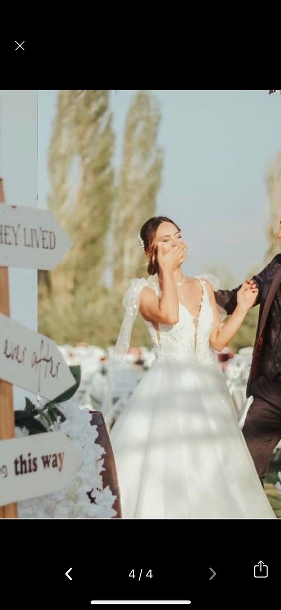 Bu beyaz A kesim gelinlik, V yakalı ve askılı kollu, klasik şıklık ile bohem tarzı birleştirir. Özel tasarımdır 53 kg da giydim kuru temizleme sonrası gönderilecektir.