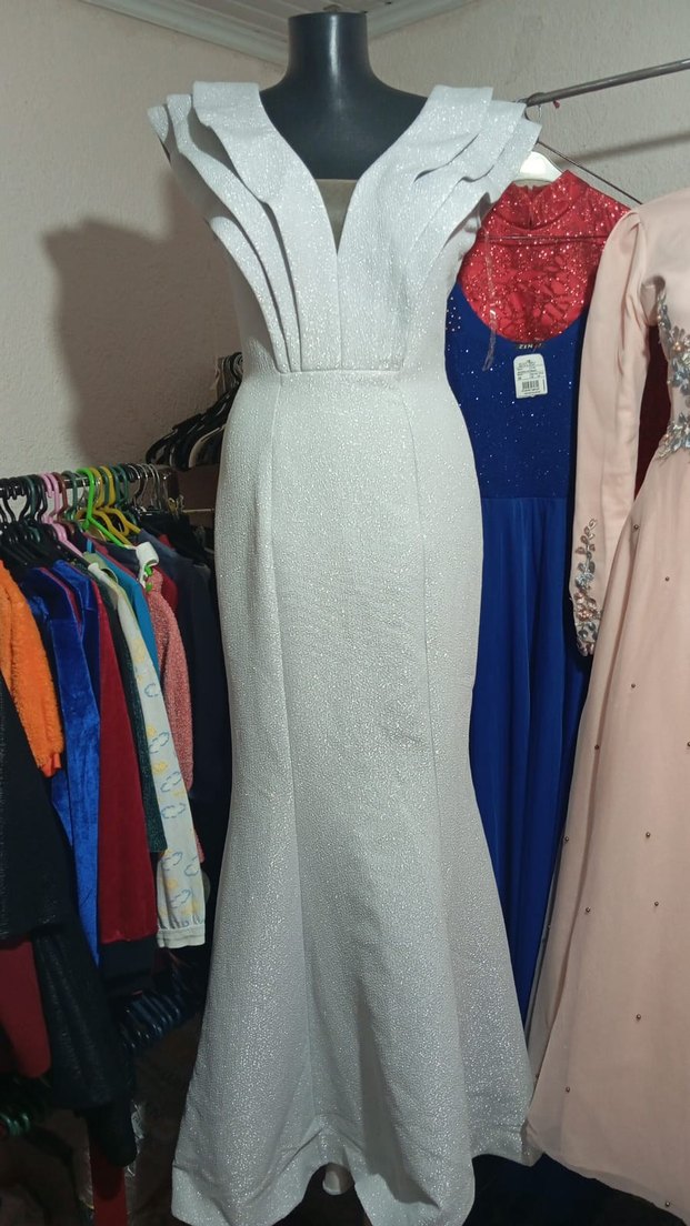 V yaka ve kolsuz tasarıma sahip beyaz uzun abiye elbise, şık pile detaylarıyla modern klasik bir görünüm sunar. ✨