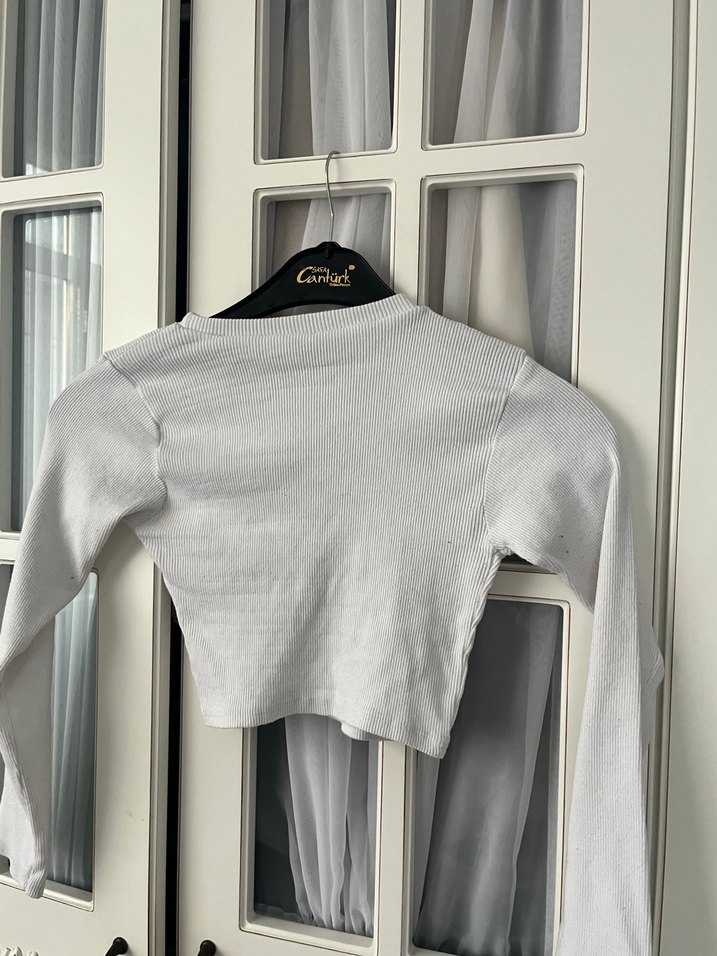Beyaz keten kumaştan, V yakalı, uzun kollu, düğmeli ve midi boyda, rahat kesimli kadın kazak.
