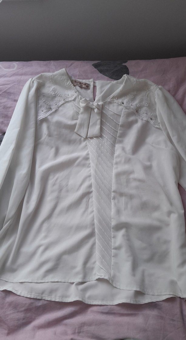 Beyaz keten kumaştan, düğmeli ve V yakalı, uzun kollu, bol kesim vintage tarzı kadın gömleği. Ofis için uygun.