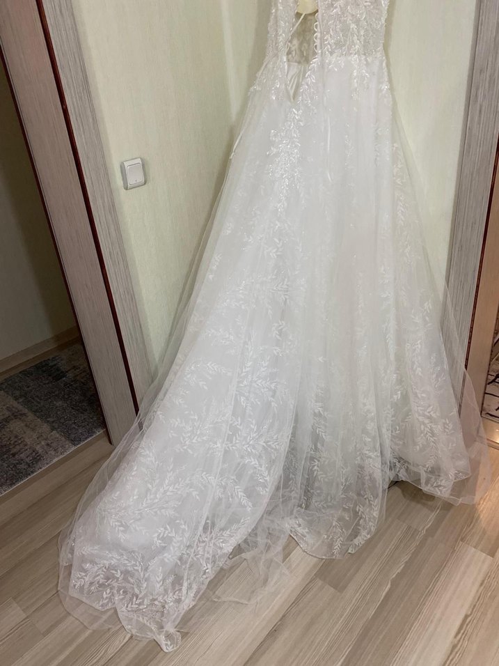Bir uzun duvak bir kısa duvak ve tarlatan ile verilecektir. Bu beyaz A kesim gelinlik, V yakalı ve ince askılıdır. Uzun boyu ve bol kesimiyle minimal bohem tarzını klasik zarafetle sunar.
