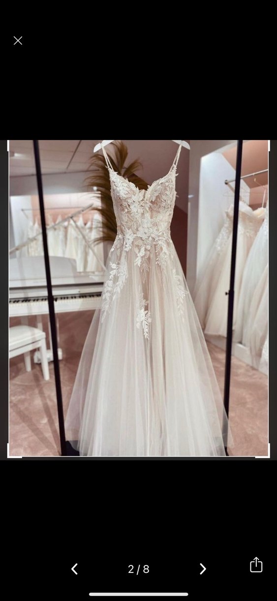 V yaka ve ince askılı, çiçek dantel işlemeli beyaz A kesim uzun gelinlik. Klasik ve bohem tarzı bir arada sunar. Kuru temizlemesi yapıldı tertemiz Adanada gazipaşada özel bir gelinlikçide diktirildi adanada elden teslim edilir