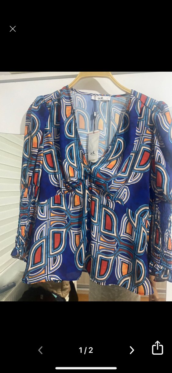 Bu bol kesim bluz, koyu çok renkli batik desenine, V yakaya ve uzun kollara sahiptir. Düğmeli ve kısa boyda, bohem tarz için uygundur.