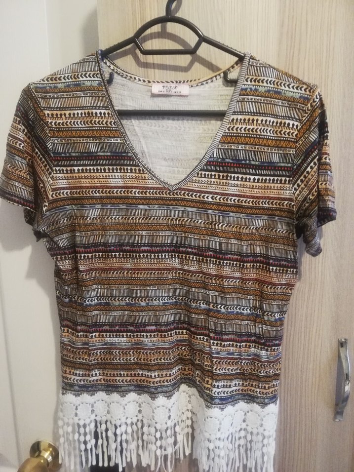 V yakalı, kısa kollu, bohem tarzda örgü bluz. Kahverengi ve gri batik desenli, alt kısmı beyaz dantel püsküllü. Günlük kullanım için uygun.