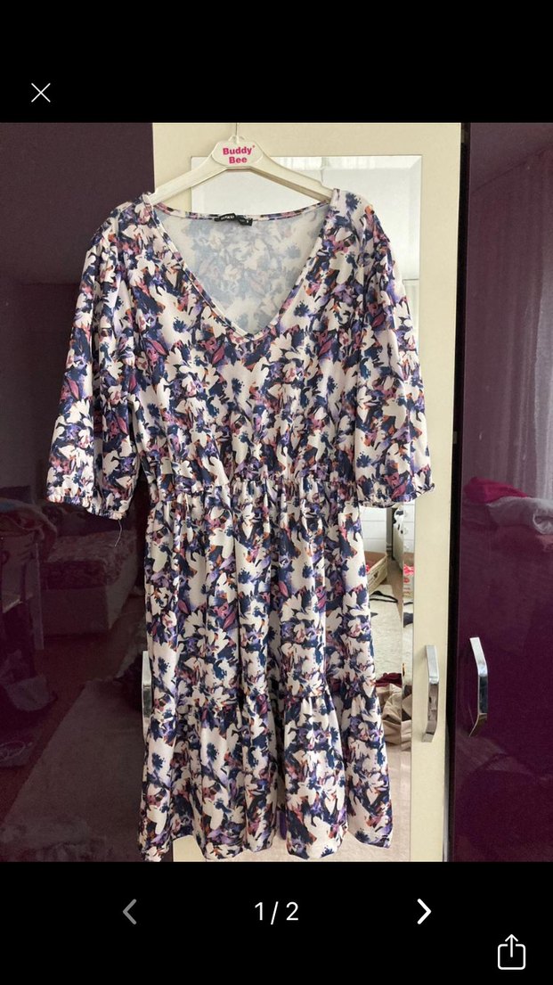 V yakalı, kısa kollu ve dökümlü bohem tarzda, açık mor tonlarında, tie-dye desenli sentetik kumaş mini elbise.