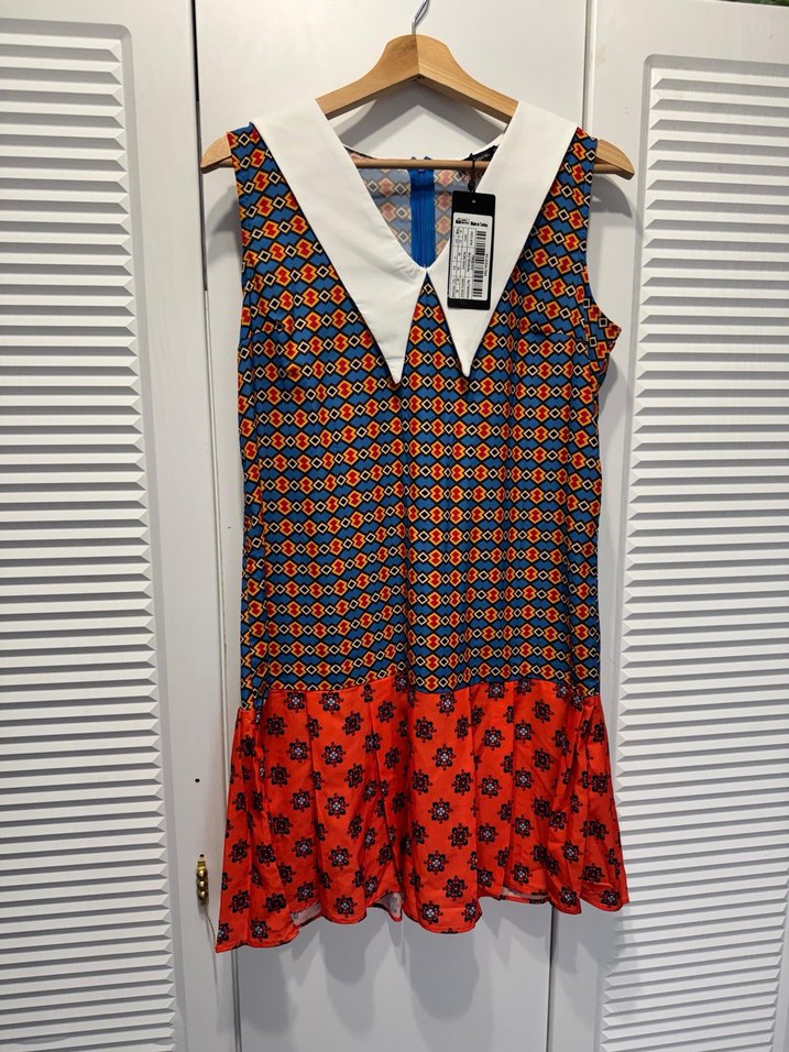 Kolsuz çok renkli eteği pileli bir dönem elbisesidir. Çok tarz bir duruşu vardır.