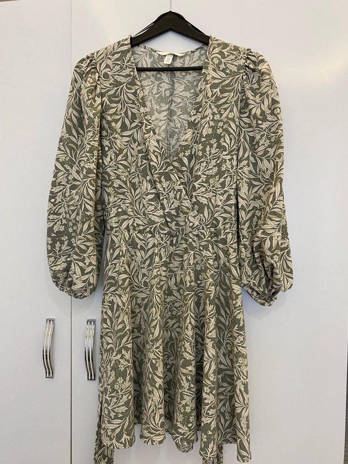 Khaki renkte, bohem tarzda uzun kollu mini elbise. V yaka ve dökümlü tasarıma sahip, yumuşak sentetik kumaştan, yaprak desenlidir. Günlük kullanıma uygun. 1 defa giydim.