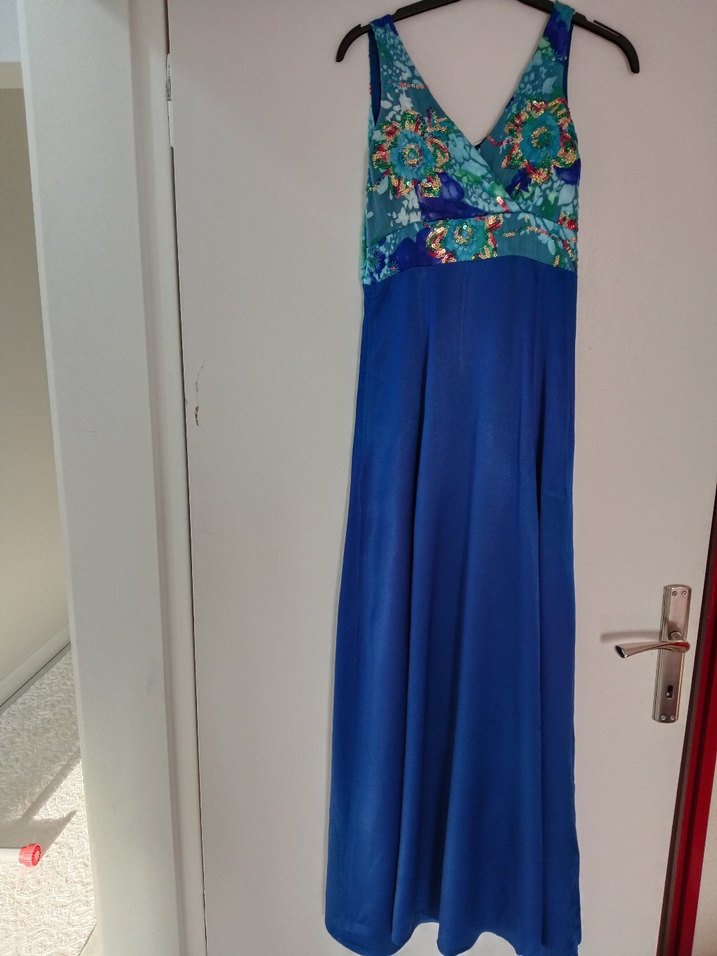 V yakalı, kolsuz, uzun ve vücuda oturan elbise. Renkli batik deseni ve drapeli tasarımıyla bohem tarzı yansıtır. Yumuşak sentetik kumaştan üretilmiştir. 1kez giyildi