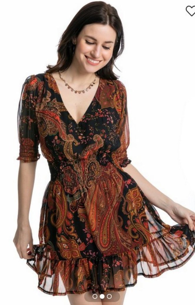 V yaka, kısa kollu, bol kesim bohem midi elbise. Boncuk detaylı, desenli koyu kahverengi, ipeksi kumaştan üretilmiştir. Romantik akşamlar için uygundur. M-S uyumlu