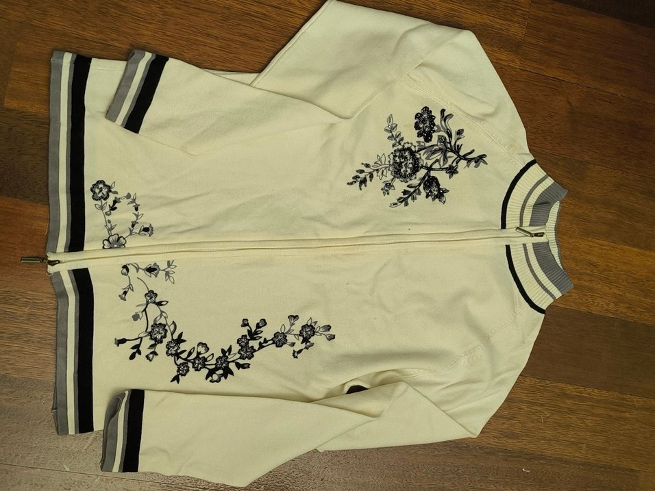 Beyaz zeminde siyah boncuk ve sarma çiçek desenli, fermuarlı, V yakalı, uzun kollu, normal boy midi kesim, bohem ve vintage tarzda kadın ceketi.Hem günlük hem abiye olarak uygundur. İki koltukaltı arası 43 cm Omuzdan etekucuna 57 cm.Yumuşacık ve hem enine hem boyuna esnek bir kumaşı var.Çift taraflı fermuarlı.Bedeni uymadığı için hiç kullanmadım tertemiz,yeni.