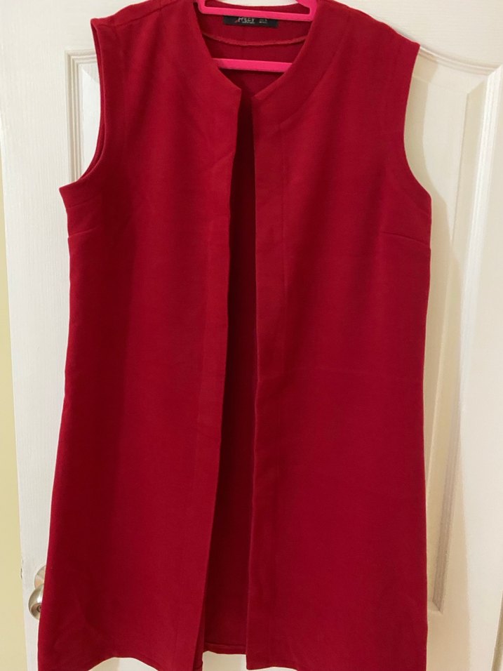 Bordo renkte, V yakalı ve kolsuz kadın yeleği. Dökümlü ve normal kesimli, parlak görünümlü, midi boyda ve yumuşak sıcak kumaştan yapılmıştır. Günlük kullanım için uygundur.