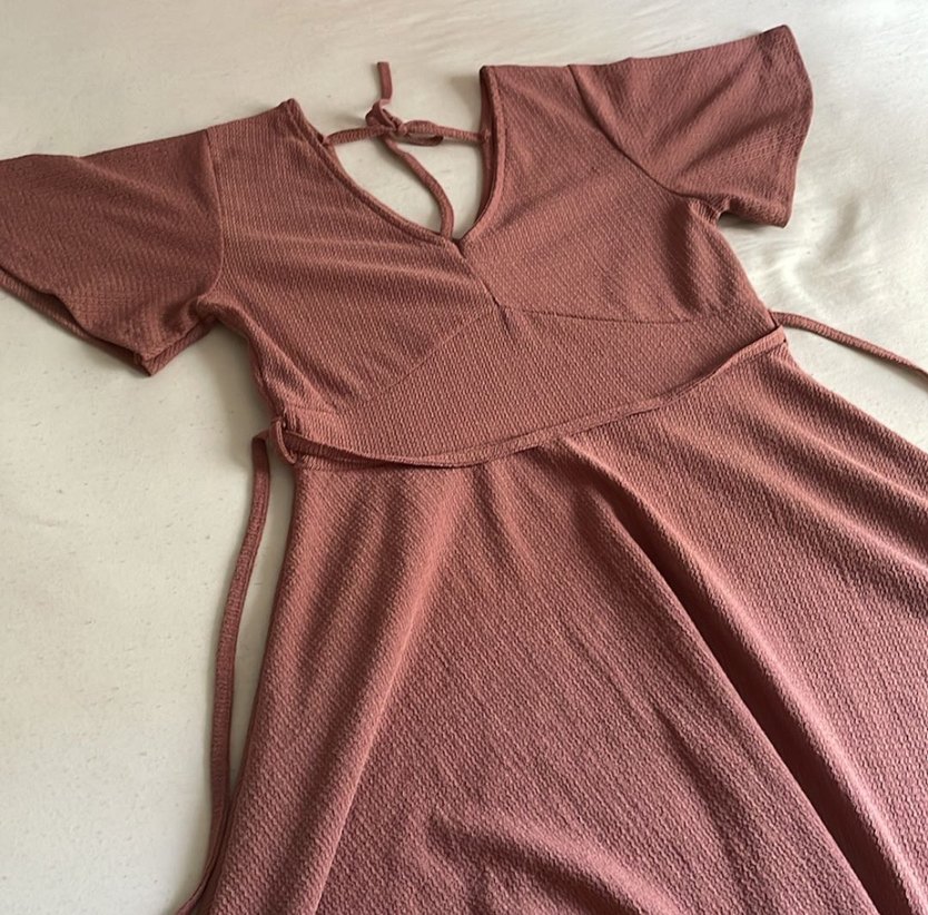Gül kurusu renkli, V yakalı ve büzgülü detaylı, ince askılı midi triko elbise. Rahat kesimli, bohem tarzda, günlük kullanıma uygun. S-M arası beden