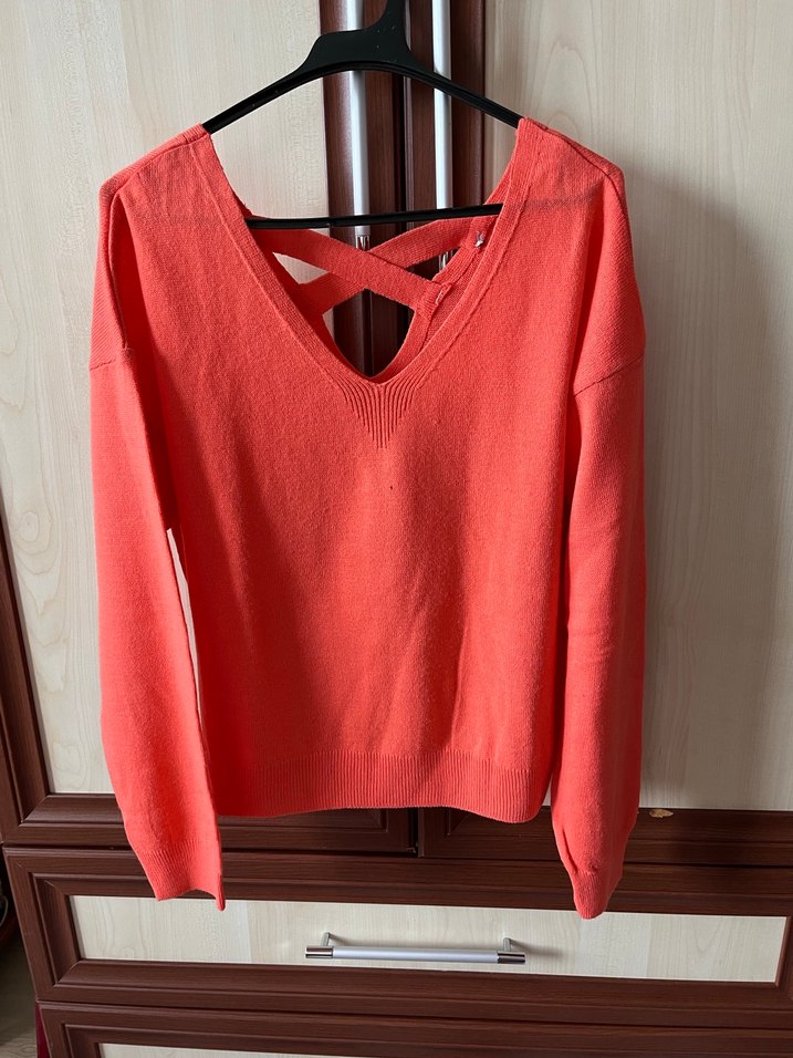 V yakalı, sırtında çapraz askı detaylı, nar çiçeği turumcumsu renkli, rahat kesim örgü kazak.
