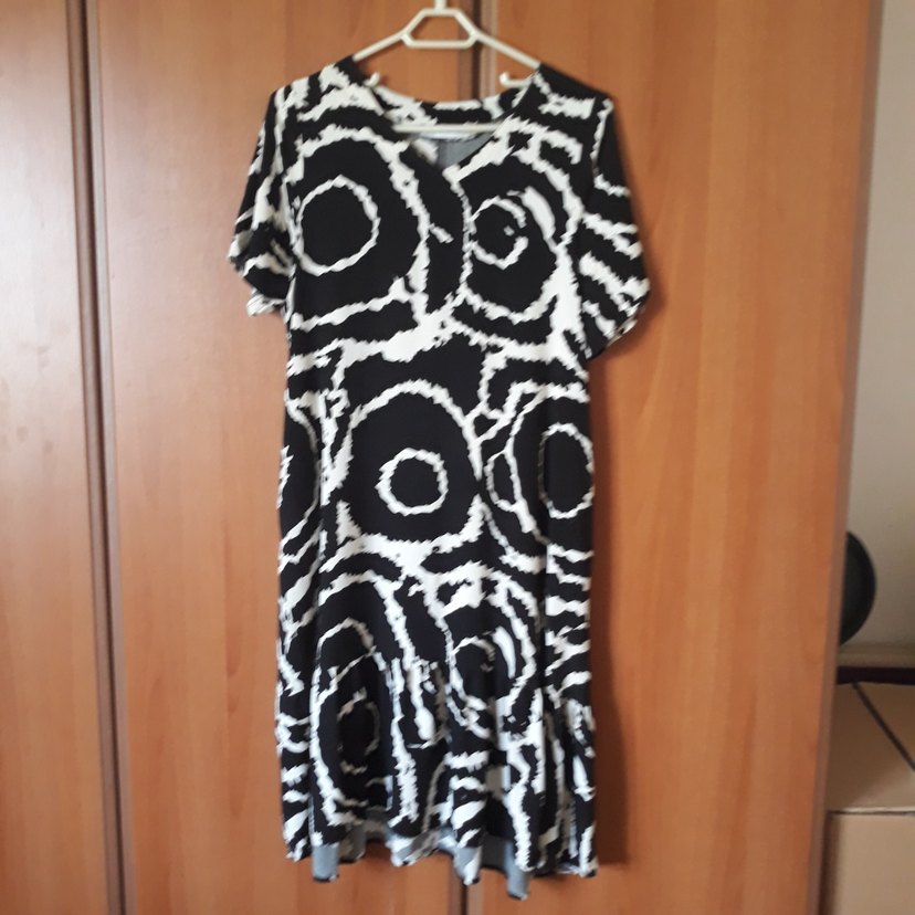 V yaka cepli siyah beyaz desenli viskon elbise