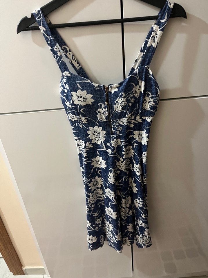 V yaka ve kolsuz tasarıma sahip, çiçek desenli lacivert midi elbise. Fermuarlı ve vintage bohem tarzını yansıtır.