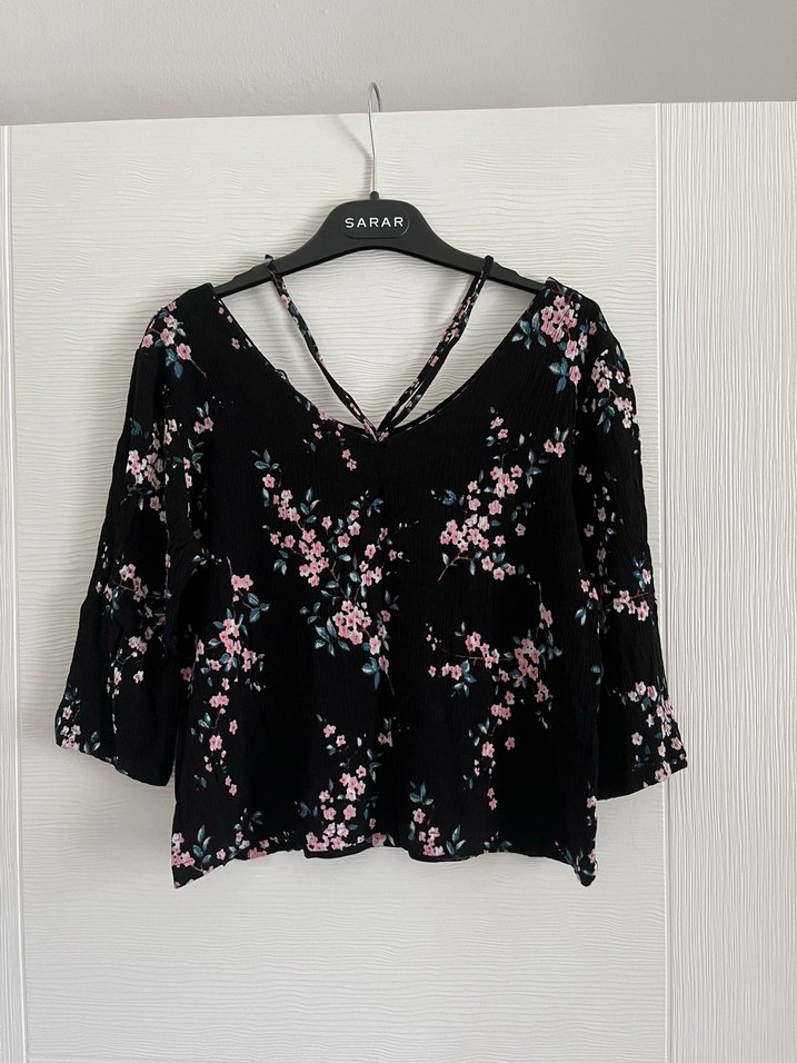 V yaka, askılı kollu, çiçek desenli siyah bluz. Bol kesim ve düğmeli detaylara sahip, günlük sokak stili için uygundur. 38 beden yazıyor ama ancak s bedene oluyor bu sebeple s işaretleyeceğim bir sorunu yok #chance #çiçeklibluz #bluz #üstgiyim #çiçekliüst #tişört