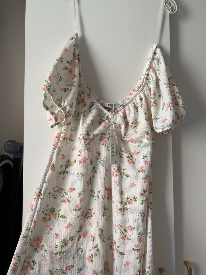 Beyaz midi elbise, V yakalı, kısa kollu ve fırfırlı, pastel çiçek desenli, bol kesim, bohem Paris tarzında. Hiç giyilmedi boyu 68 cm.