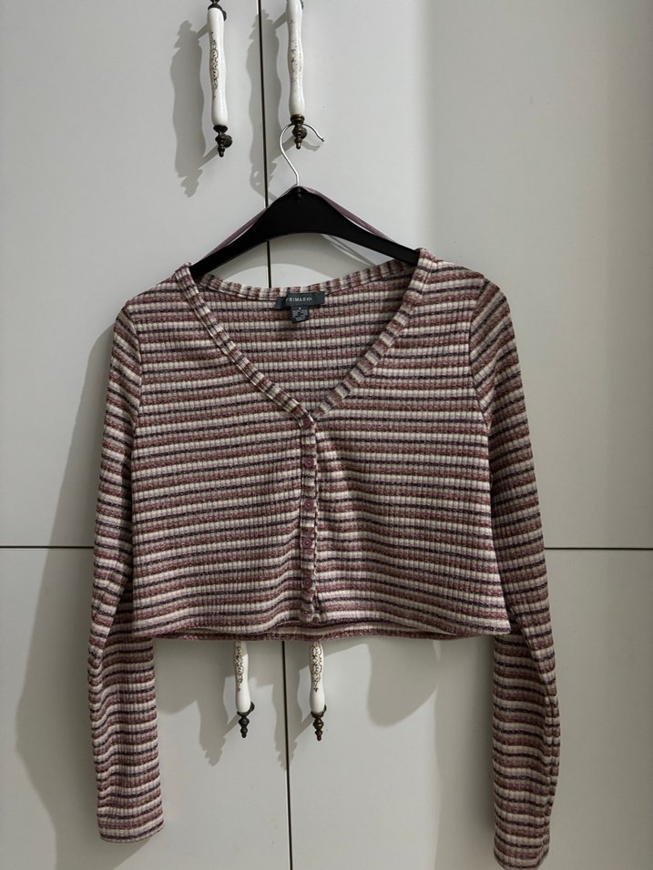 V yaka , uzun kollu, örme ve fitted kesime sahip hırka. Normal midi boyda, pembe ve gri tonlarında, günlük ve crop tarzında. S-m bedenler giyebilir