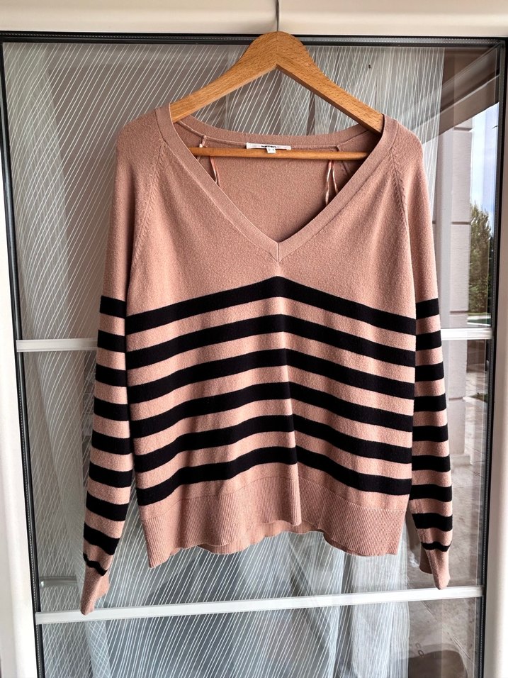 V yaka, uzun kollu bej triko kazak, yatay siyah çizgilerle. Bol kesim ve normal boyda, rahat kullanım için uygundur.