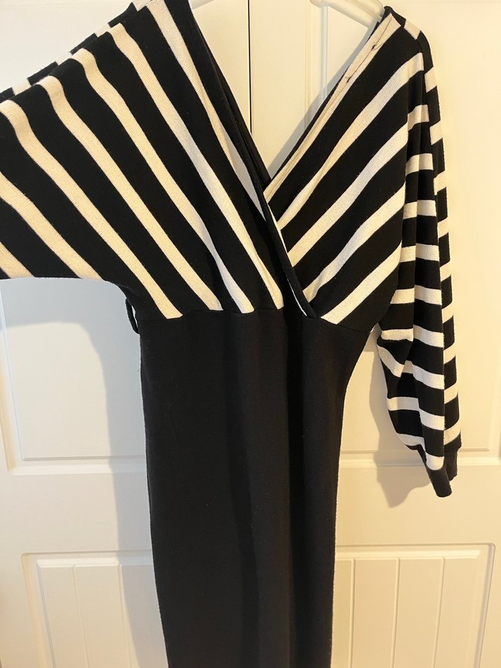 V yaka, drapeli ve çizgili üst kısmıyla siyah beyaz uzun, fitted triko elbisedir. Strappy kollu ve ofis kullanımı için uygundur.