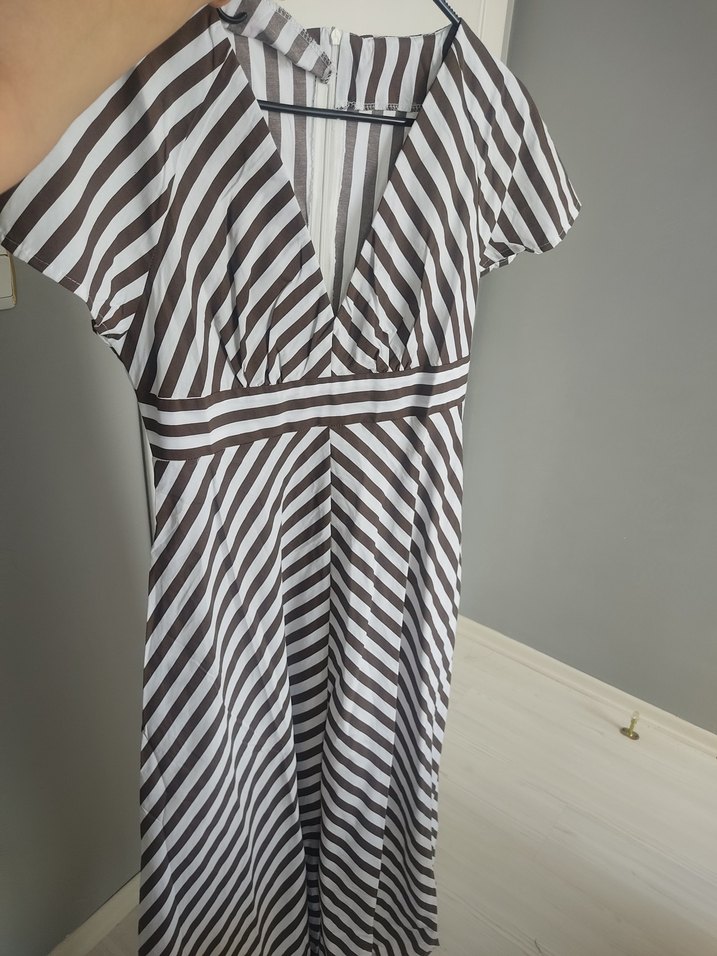 V yaka, kısa kollu ve pileli çizgili hamile elbisesi. Bej ve gri tonlarında, günlük kullanıma uygun şık sokak stili elbise.