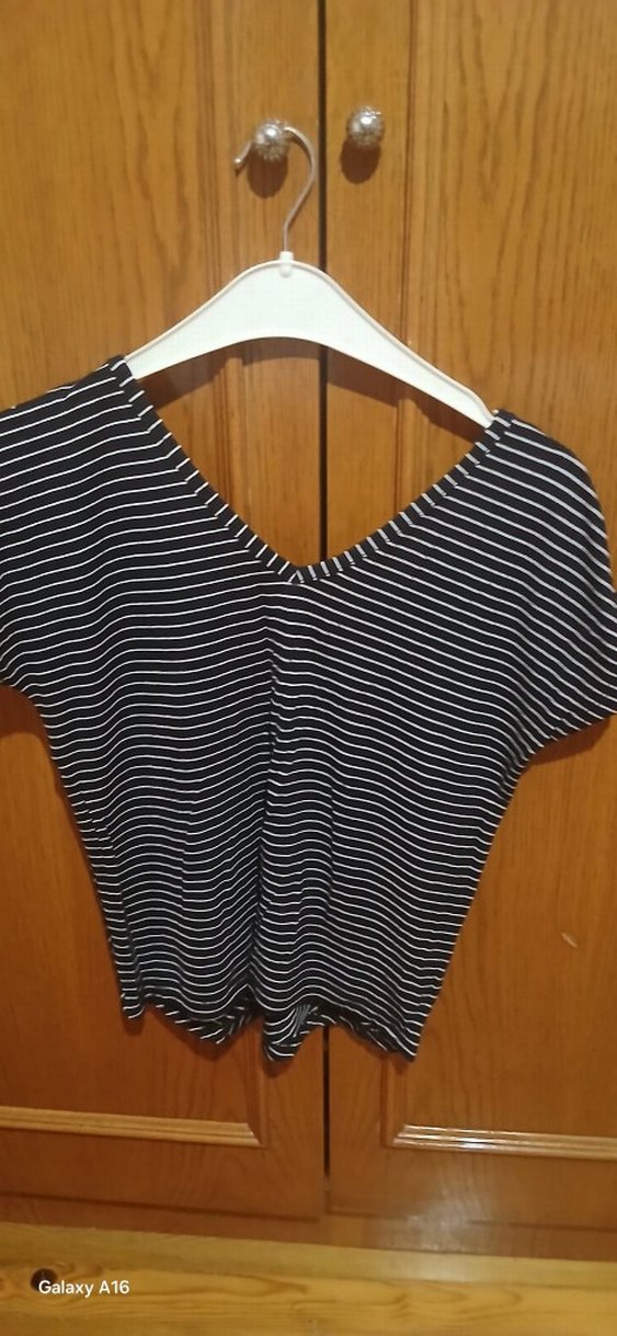 V yaka, kısa kollu, siyah beyaz çizgili, normal midi boyda, kadın bluz. Günlük ve sokak stiline uygun.