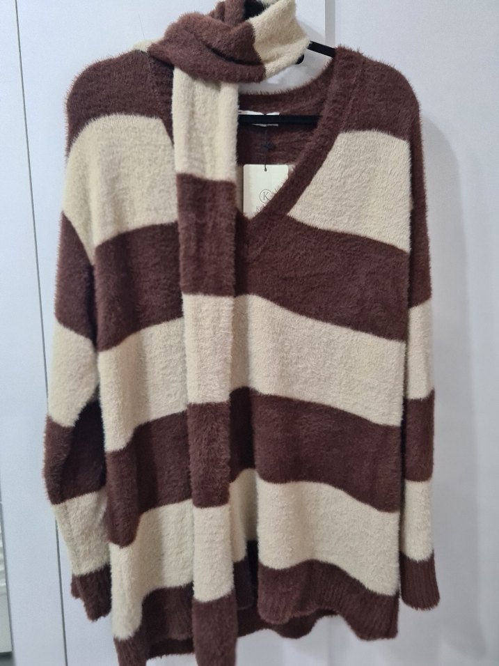 Kadınlar için kahverengi ve bej tonlarında çizgili, V yakalı, uzun kollu, bol kesim yün triko kazak. Rahat ve midi boyda, günlük kullanıma uygun. Premium kumas oversize geniş kalıp standart bedendir 36_44 beden aralığına rahatlıkla uygundur yumuşacık esnektir Ürün boy ölçüsü 75cm uzun modeldir şal isteğe göre kuşak şeklinde kullanılabilir Renk:Kahverengi _Kremrengi marka temsilidir #büyükbeden #oversize