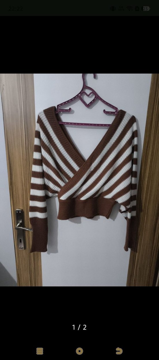 Bu rahat triko kazak, V yaka ve uzun kolludur. Açık kahverengi ve beyaz çizgili, bol kesim ve normal midi boydadır, günlük sokak stiline uygundur.