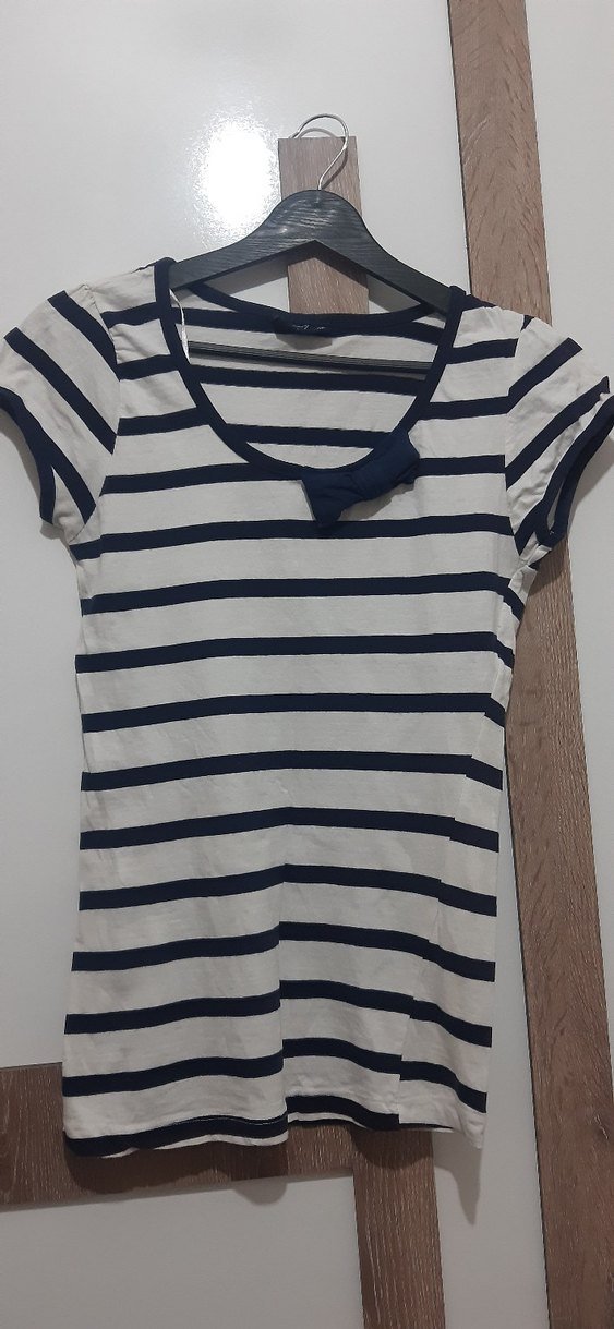 Pamuklu, çizgili, v yaka ve kısa kollu, rahat kesimli kadın tişörtü, günlük sokak stiline uygun.
